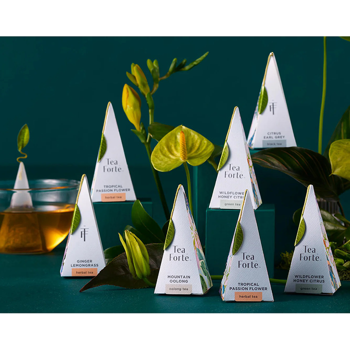 - 10 pyramid infusers include Citrus Earl Grey (black tea), Mountain Oolong (oolong tea), Wildflower Honey Citrus (green tea), Ginger Lemongrass (herbal tea), and Tropical Passion Flower (herbal tea)