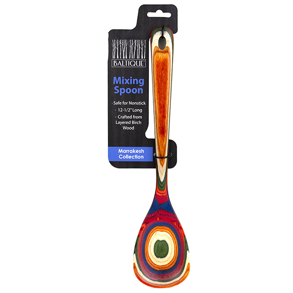 Add a splash of warming color to your kitchen with the Totally Bamboo 12.5" Baltique Marrakesh Spoon. This eye-catching utensil is masterfully crafted from layers of colored birched wood to create a gorgeous color array. The Marrakesh Collection features a rainbow blend of red, green, orange, blue and natural wood colors. The colorway was inspired by the bright and colorful marketplaces of Morocco. This brightly colored cooking utensil is great as both a functional mixing spoon for hot and cold foods, as well as for serving guests. At 12.5" long it provides ample length for any cooking application and is safe for use on nonstick coatings! Includes a convenient hanging hole for easy storage and display. To clean, hand wash or wipe with a damp cloth; do not soak or wash in the dishwasher.