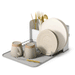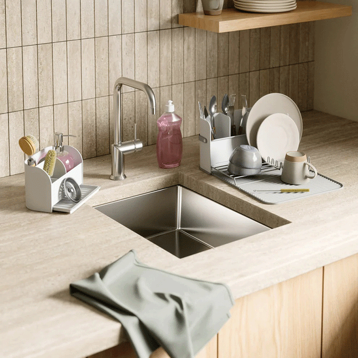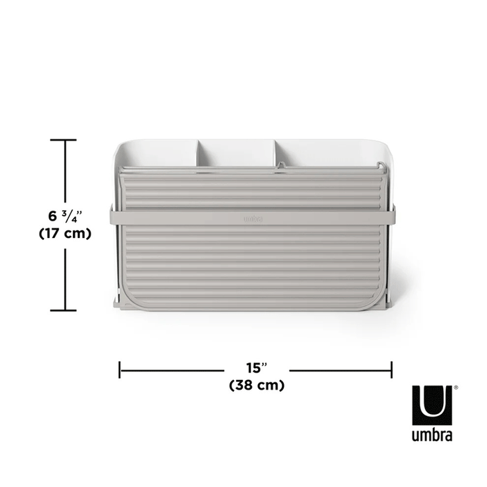Umbra's Sling Dish Rack is the practical, best-designed dish-drying solution for tight spaces. The Sling is made to maximize dish-drying capacity while minimizing countertop clutter, and it manages that brilliantly. It's perfectly suited to handle up to 5 basic place settings, including utensils and glassware. It features a metal foldaway rack and a folding rubberized mat that fits perfectly into a convenient caddy base. The rack promotes airflow and holds up dinnerware, while the ribbed mat cushions glassware and keeps your counter dry. The base has three divided sections for your cutlery, large utensils, or dish-cleaning accessories like sponges and scrub brushes. Not only is the Sling Dishrack incredibly functional, it's also very portable. It folds into a secure compact package for easy storage when you're not using it or to stash it into a cabinet or shelf. The Umbra Sling Dish Rack measures 15" l x 12.9" w x 6.75" h and is made from 50% recycled plastic.