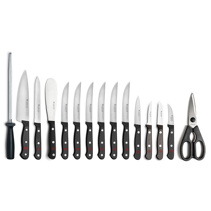 The Wusthof Gourmet 16 Piece Knife Block is a comprehensive set of kitchen and dining room essentials, with a practical selection that favors the smaller knives that see the most use. The Gourmet 16-pc is an excellent choice for newer cooks and those who want to upgrade their kitchen cutlery affordably. The selection includes the 2.75" Paring Knife, 2.75" Trimming Knife, 3" Spear Point Paring Knife, 4.5" Utility Knife, Six-4.5" Steak Knives, 5" Spreader, 5" Serrated Utility Knife, 6" Cook's Knife, 9" Honing Steel, Wusthof Come-Apart Kitchen Shears and a 15 Slot Acacia Wood Storage Block. This set is all you need for the vast majority of food prep, with knife options for the most common home kitchen jobs. Plus you get 6 fine-edged steak knives for the dining room.