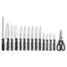 - Pieces include 2.75" Paring Knife, 2.75" Trimming Knife, 3" Spear Point Paring Knife, 4.5" Utility Knife, Six-4.5" Steak Knives, 5" Spreader, 5" Serrated Utility knife, 6" Cook's Knife, 9" Honing Steel, Come-Apart Kitchen Shears, 15 Slot Acacia Storage Block