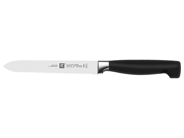 The Zwilling J.A. Henckels Four Star 5" Serrated Utility Knife is a mid-length, narrow blade with a points-out serrated edge. And if your kitchen is like most, this is one of the knives that will see the most frequent use. That's because it slices a wide range of cooked meats, cheeses, bagels, breads, tomatoes, and fruits brilliantly, and feels controlled and effortless in use. This SIGMAFORGE blade is made from Zwilling's premium high-carbon, no-stain steel. The Four Star line is famous for bringing value and affordability using an innovative, rat-tail tang design that's seamlessly bonded to a durable molded handle. The seamless design is NSF-certified and a practical favorite among professional chefs. But the Four Star blade is no different from Zwilling's other premium lines. Thin-ground blades with laser-controlled edges that are cut to a very fine 15° angle per side. The performance is fast, smooth, and precise.